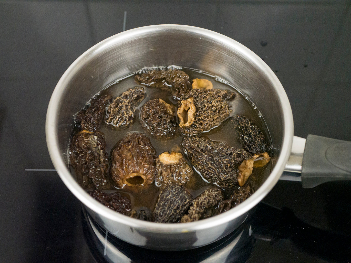 Bedecken Sie Ihre Pilze mit lauwarmem Wasser für 2 bis 3 Stunden, sie werden ihr Volumen verdoppeln und 4 bis 5 Mal ihr Gewicht zurückgewinnen. Lassen Sie sie vorsichtig abtropfen und spülen Sie sie bei Bedarf ab. In diesem Schritt sind sie bereit zum Kochen!